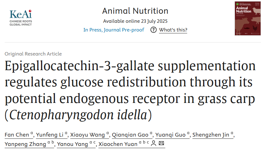 本网讯 学院袁小琛副教授课题组在《Animal Nutrition》上发表了题为《Epigallocatechin-3-gallate supplementation regulates glucose redistribution through its potential endogenous receptor in grass carp (Ctenopharyngodon idella)》的研究论文,初步揭示了EGCG通过潜在内源性受体调节草鱼高糖或高脂摄入后体内葡萄糖再分配的分子机制。