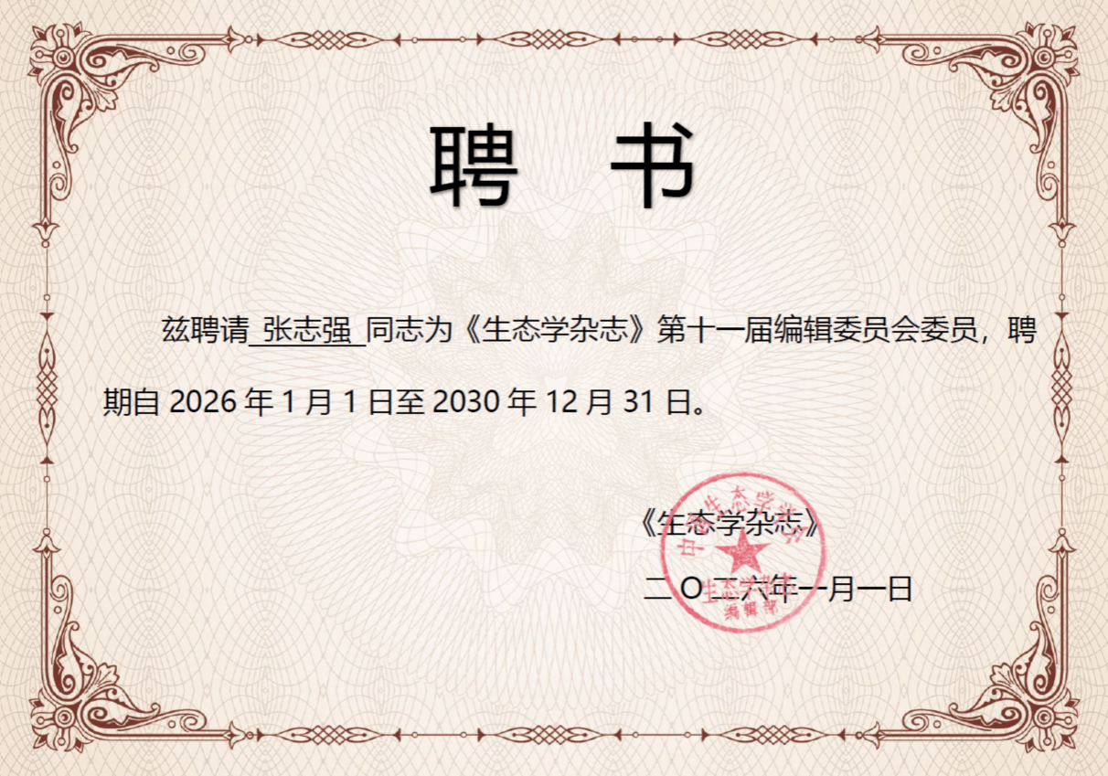 本网讯 近日,中国科学院沈阳应用生态研究所旗下《应用生态学报》与《生态学杂志》完成编委会换届工作。本次编委及青年编委征集共收到1200余人报名,经编辑部遴选、主办单位及主编审议,我院张志强教授受聘为《生态学杂志》第十一届编委会委员,任期自2026年至2030年。