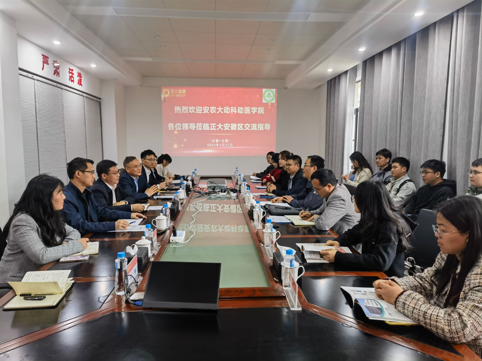 本网讯 3月27日下午,动物医学院党委书记吴永红、党委副书记张锐、动物科技学院党委副书记卢伟和10名毕业生代表赴合肥正大集团(安徽区)访企拓岗。正大集团安徽区饲料事业副总裁张俊波、人力资源总监林光阳、事业总经理2007级动物医学专业校友何志强等7名负责人参加活动。
