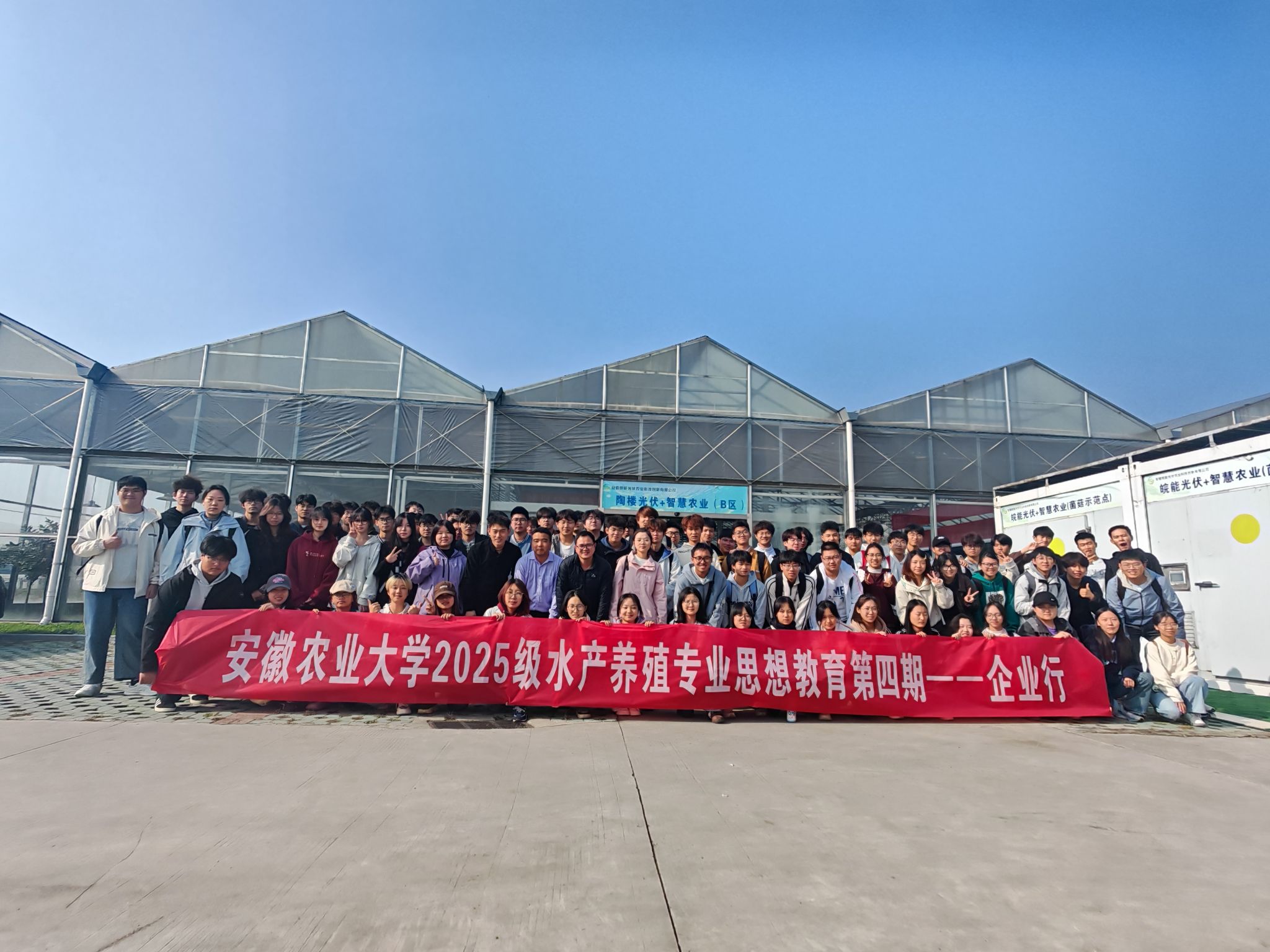 安徽皖能光伏农业科技创新有限公司,2002级校友汪洋、2004 级校友刘超热情接待,不仅带领同学们实地观摩“光伏+渔业”生态化、智能化养殖模式,更结合从业经历分享职业感悟,勉励大家扎根专业、深耕绿色养殖,让新生直观感受专业在生态发展中的价值。大家深切感受科技赋能水产养殖的强劲动力。