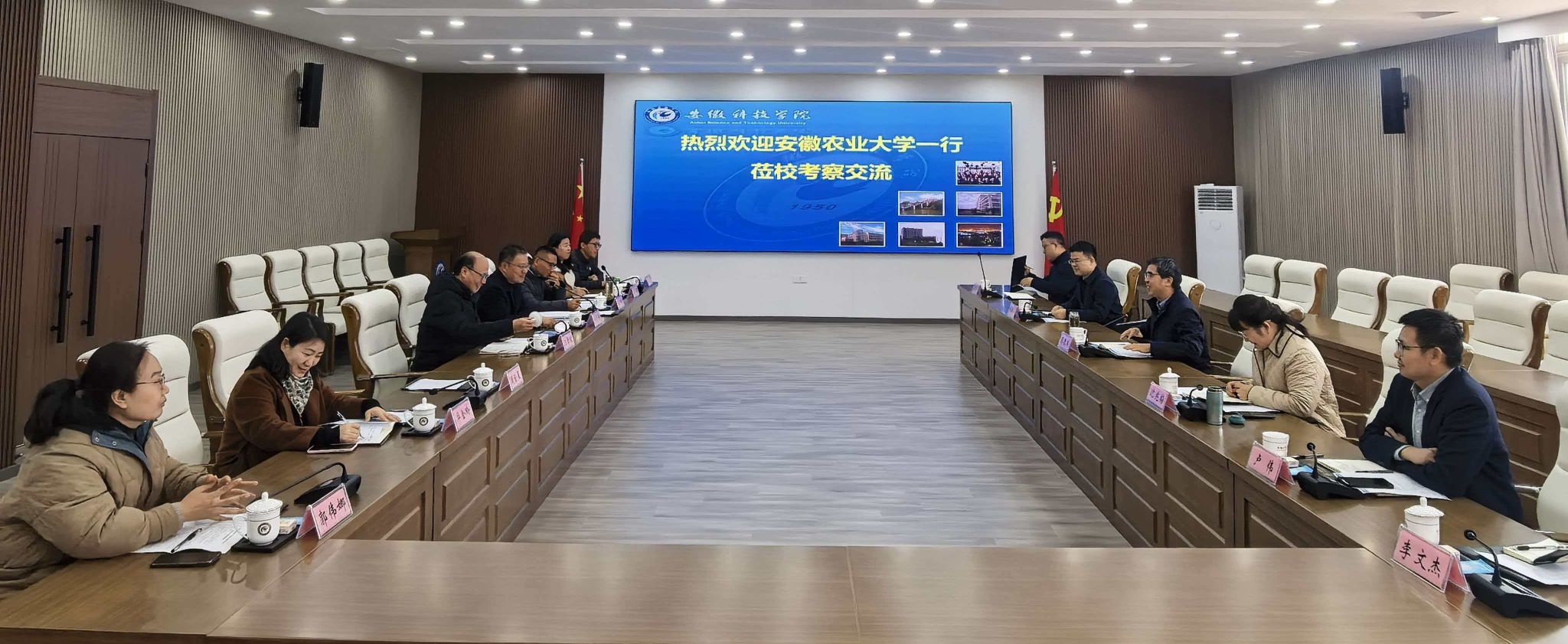 蔡德军一行首先来到安徽科技工程大学,会前和安徽科技工程大学校长、我校1998杰出校友李升和、安徽科技工程大学党委委员、纪委书记彭庆刚进行了交流。安徽科技工程大学党委委员、副校长王孝义、安徽科技工程大学动物科学学院有关负责同志等参加座谈。双方围绕人才培养模式创新、高水平科学研究合作、社会服务能力提升、党建与思想政治工作以及毕业生高质量就业等核心议题进行了深入交流。双方一致认为,两校同根同源、情谊深厚,合作基础扎实,未来应进一步发挥各自优势,在学科建设、平台共享、师资互访、学生联合培养等方面拓展合作空间,共同服务地方经济社会发展和行业进步。