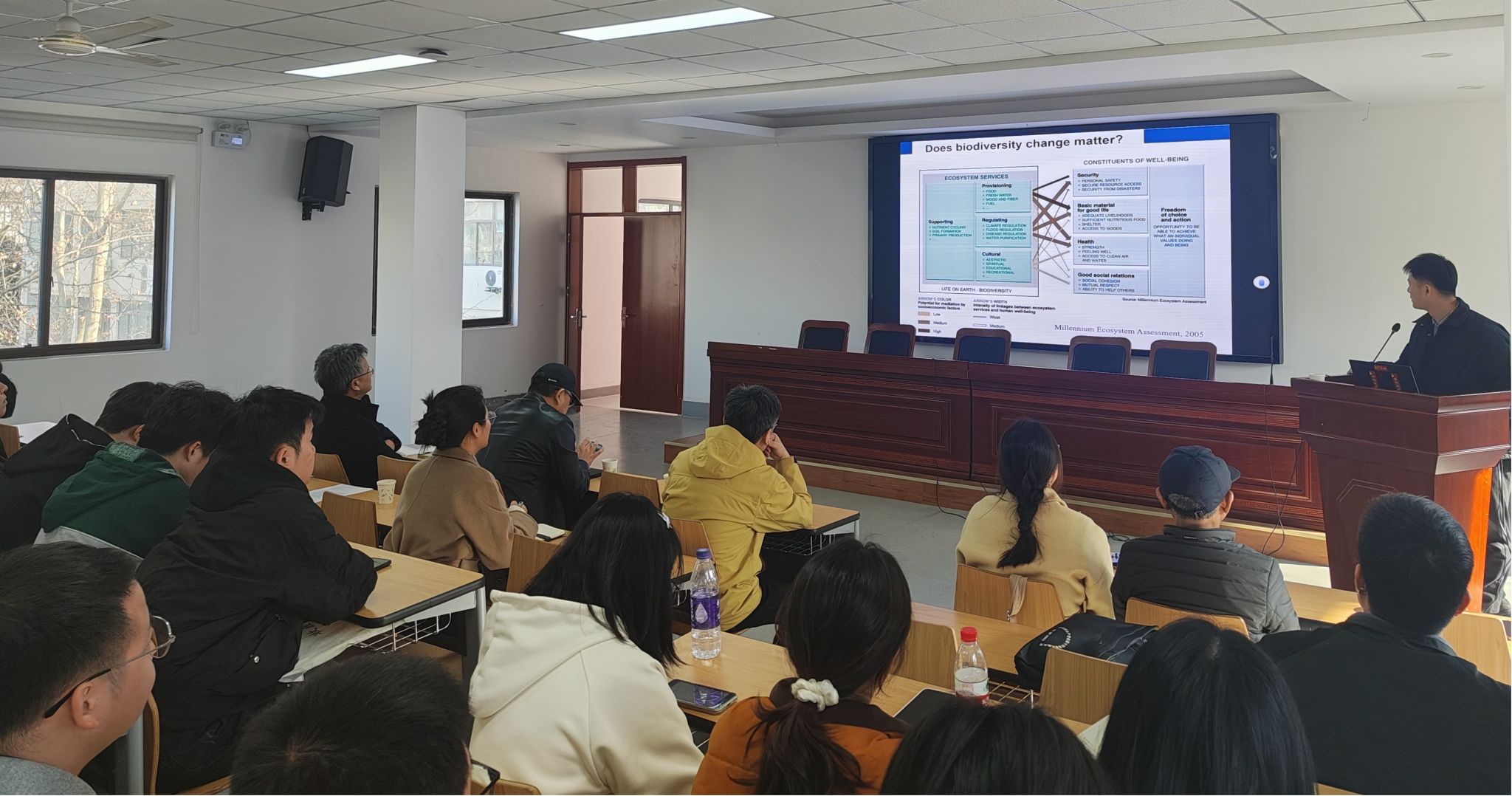 张鹗研究员就“熟知非真知”中国淡水鱼类多样性为主题,以自身在淡水鱼类物种探索的道路进行了多方位的介绍与分享。首先介绍新物种的发现如黑斑异华鲮、圆尾薄鳅等。其次就中国淡水鱼类物种数目、鱼类物种鉴定、中国亚热带低地鱼类、二十一世纪生物分类学为四个模块逐一进行讲解。蒋忠冠教授就“长江中下游洪泛湖泊鱼类多样性和群落稳定性的保护管理”为主题,介绍了各类因素对鱼类多样性的影响,并厘清了鱼类群落多样性和渔业稳定性的关系。会后,两位专家与在场学生与老师进行了深入的交流与探讨,学生反响热烈,收获颇丰。