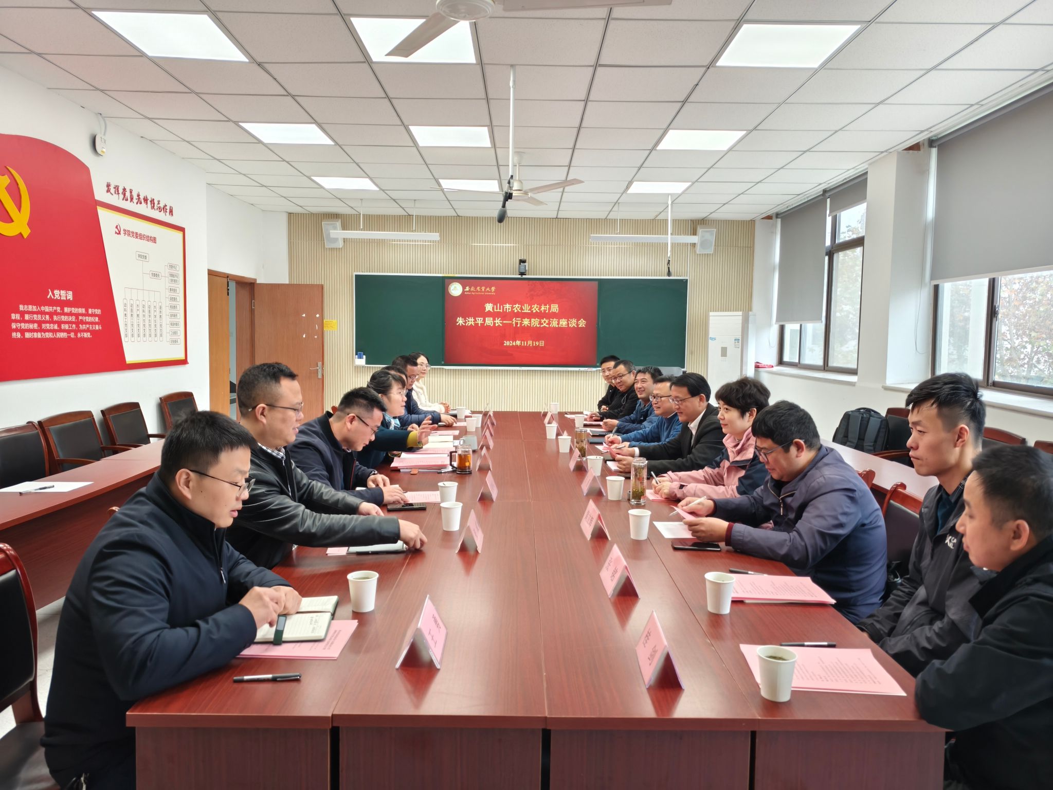 本网讯 11月19日,黄山市农业农村局朱洪平局长、市畜牧兽医站吴承武站长一行9人来学院开展座谈交流,就黄山市畜牧业高质量发展及皖南花猪产业研究院合作共建事宜洽谈合作。学院党委书记沈兆梅、院长张子军、副院长曹祖兵、生猪育种与创新团队成员及部分动科系老师参加座谈会。