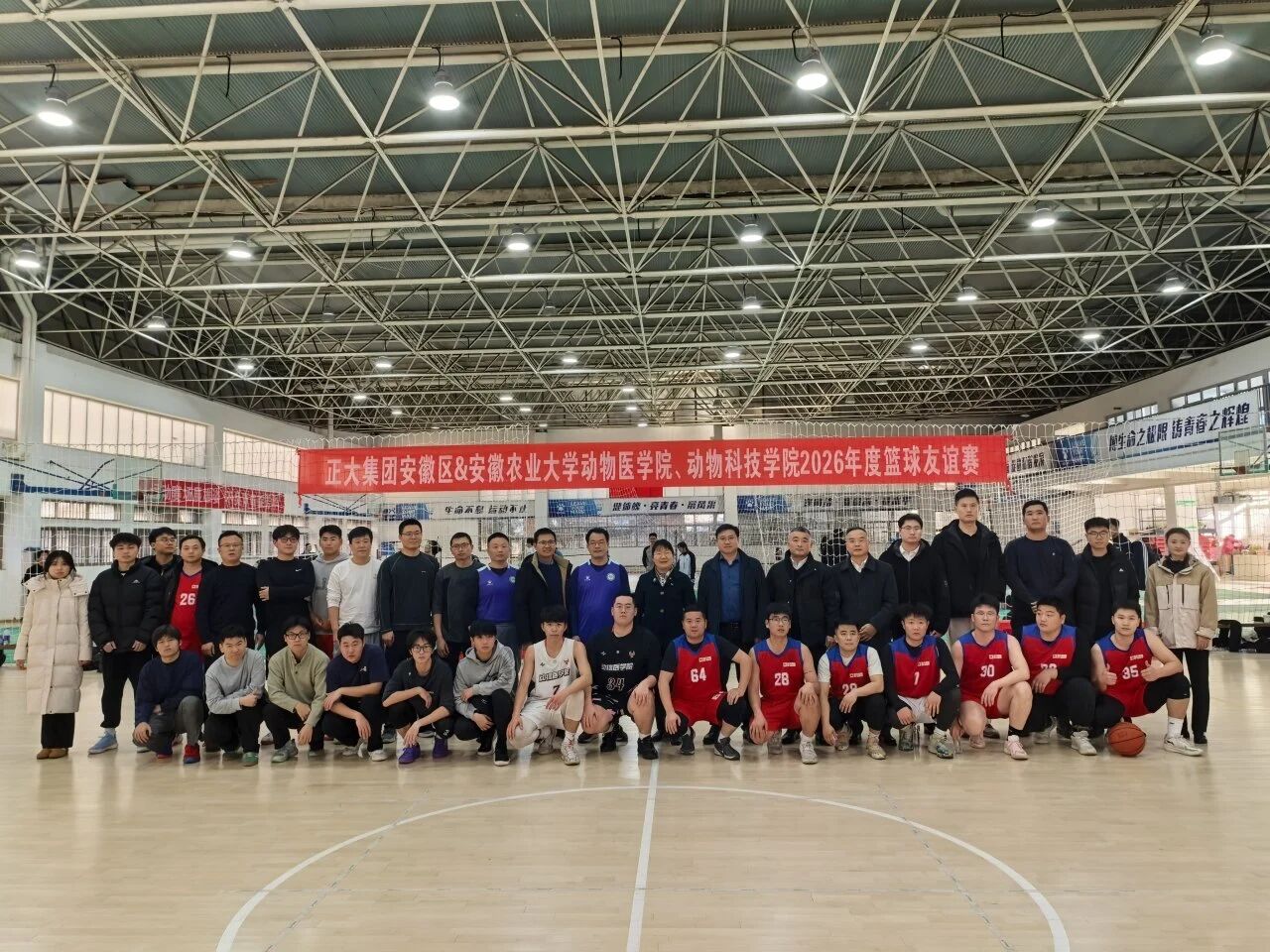 本网讯 1月7日下午,动物科技学院、动物医学院与正大集团安徽区在校体育馆开展了一场汇聚校企活力、激扬冬日热情的篮球友谊赛。动物科技学院党委书记沈兆梅、动物医学院党委书记吴永红、动物科技学院党委副书记卢伟;正大安徽区饲料事业副总裁张俊波、安徽区HRBP总监林光阳、正大食品(合肥)有限公司总经理金松、滁州正大有限公司总经理方佳等校企双方领导及代表共同出席活动,并为队员们助阵观赛。
