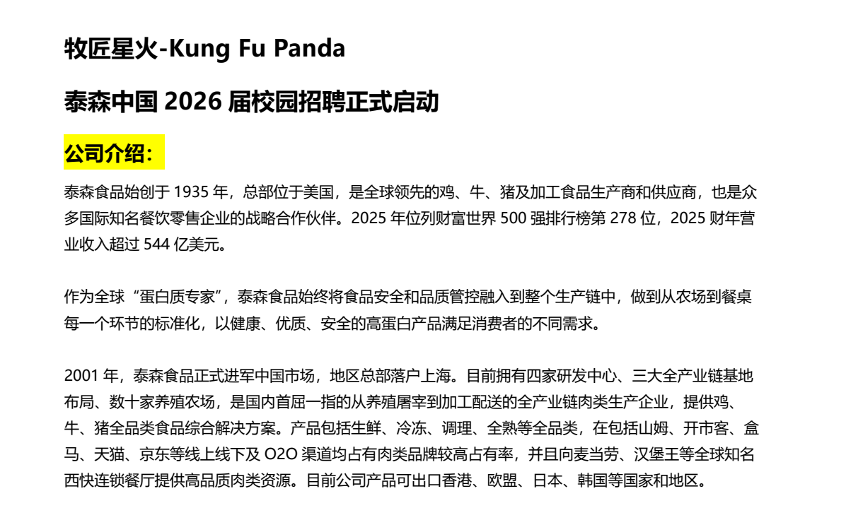 泰森中国 2026 届校园招聘