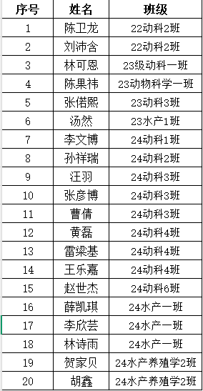根据《中国共产主义青年团发展团员工作细则》(中青发〔2023〕13号)文件要求,经学生申请,团支部推荐,学院分团校结业考核,学院团委综合考察,现将拟推荐发展团员名单公示如下:公示时间:2025年4月11日—4月17日公示期内,若有异议,请于2025年4月17日17:00之前以书面形式向动物科技学院反映。联系人:侯老师联系电话:0551-65780532邮箱:1047469763@qq.com 动物科技学院团委2025年4月11日