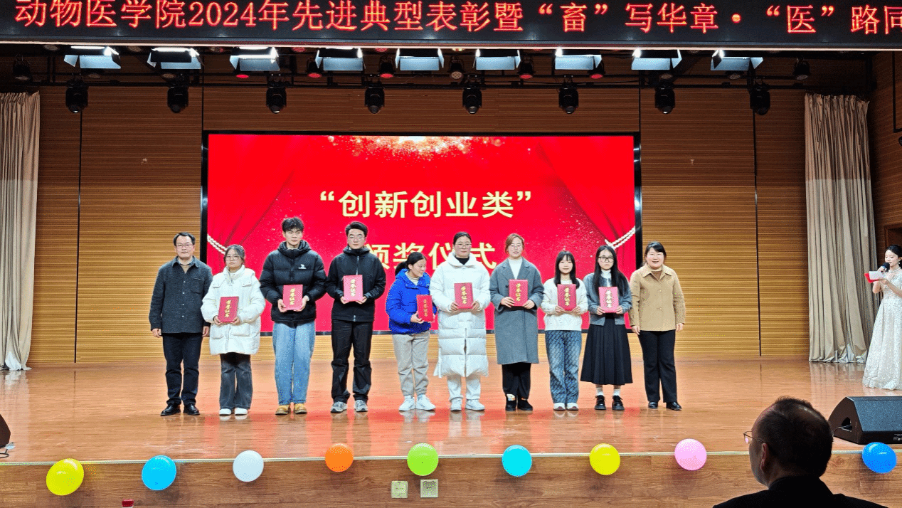 本网讯 12月24日晚动物科技学院、动物医学院于校欣苑食堂四楼小礼堂举行动物科技学院、动物医学院2024年先进典型表彰暨“畜”写华章,“医”路同行迎新晚会。校党政办公室主任戴照力、校党委组织部常务副部长韩弥明、校党委宣传部常务副部长姚莉、校学生处处长任琪、校团委副书记陈公伟、安徽温氏总经理廖理克、安徽温氏行政综合部经理祝宝璐、安徽温氏人力资源部经理王秀出席会议并为获奖同学颁奖。学院领导班子成员、系部正副主任,党支部书记、全体辅导员班主任老师及2024级全体同学参加本次晚会。