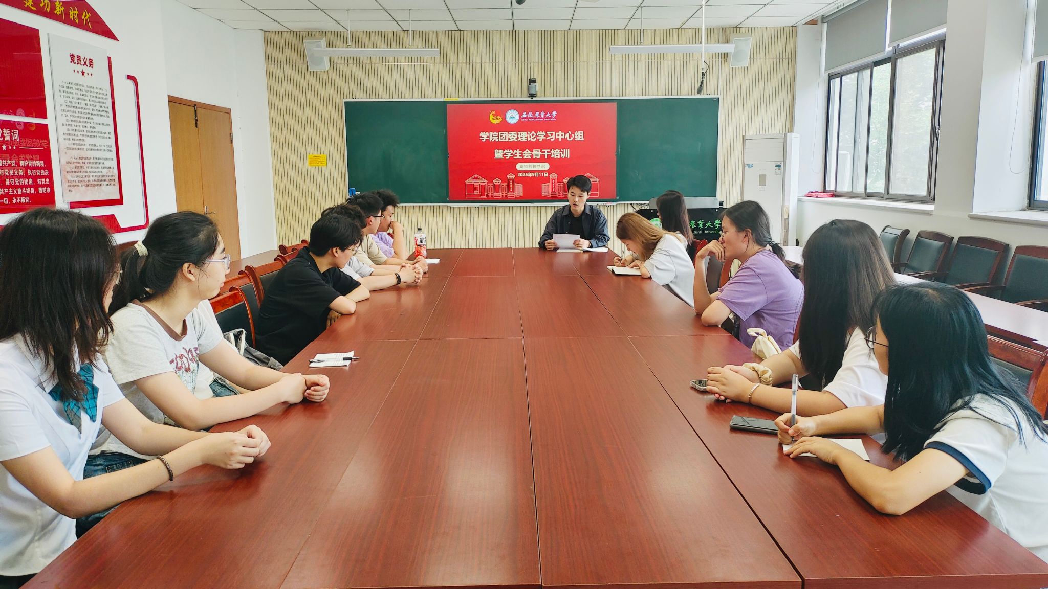 本网讯 9月11日中午,学院在306会议室召开团委理论学习中心组会议暨学生会骨干培训。团委理论学习中心组成员及学生会骨干参加会议,团委老师主持。