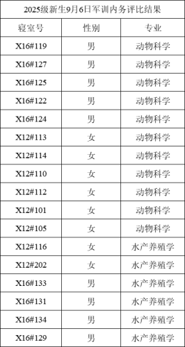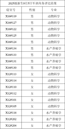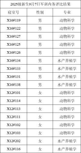 学院2025级新生军训内务评比结果公示(9月5日-7日)