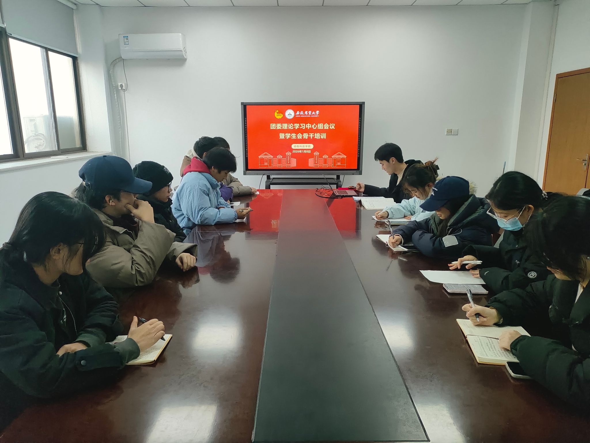 本网讯 1月8日下午,学院在动科楼308会议室召开团委理论学习中心组会议暨学生会骨干培训。学院团委理论学习中心组成员、学生会骨干参加会议,会议由学院团委负责老师主持。会议集中学习了习近平总书记二〇二六年新年贺词。会议强调,要认真领会贺词精神,把握发展大势,凝聚奋进力量,切实把学习成果转化为推动工作的实际成效。会上,学院团委老师就2026年寒假“返家乡”社会实践、本科各年级素拓分修缮等近期重点工作进行了再部署、再动员。(文:侯坤 图:石浩鑫 初审:郭佳 复审:卢伟 终审:沈兆梅)