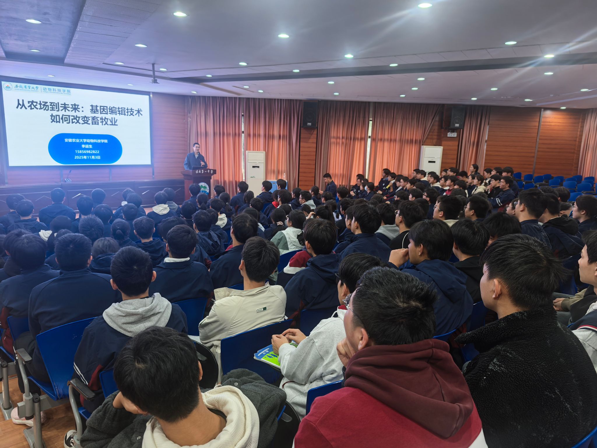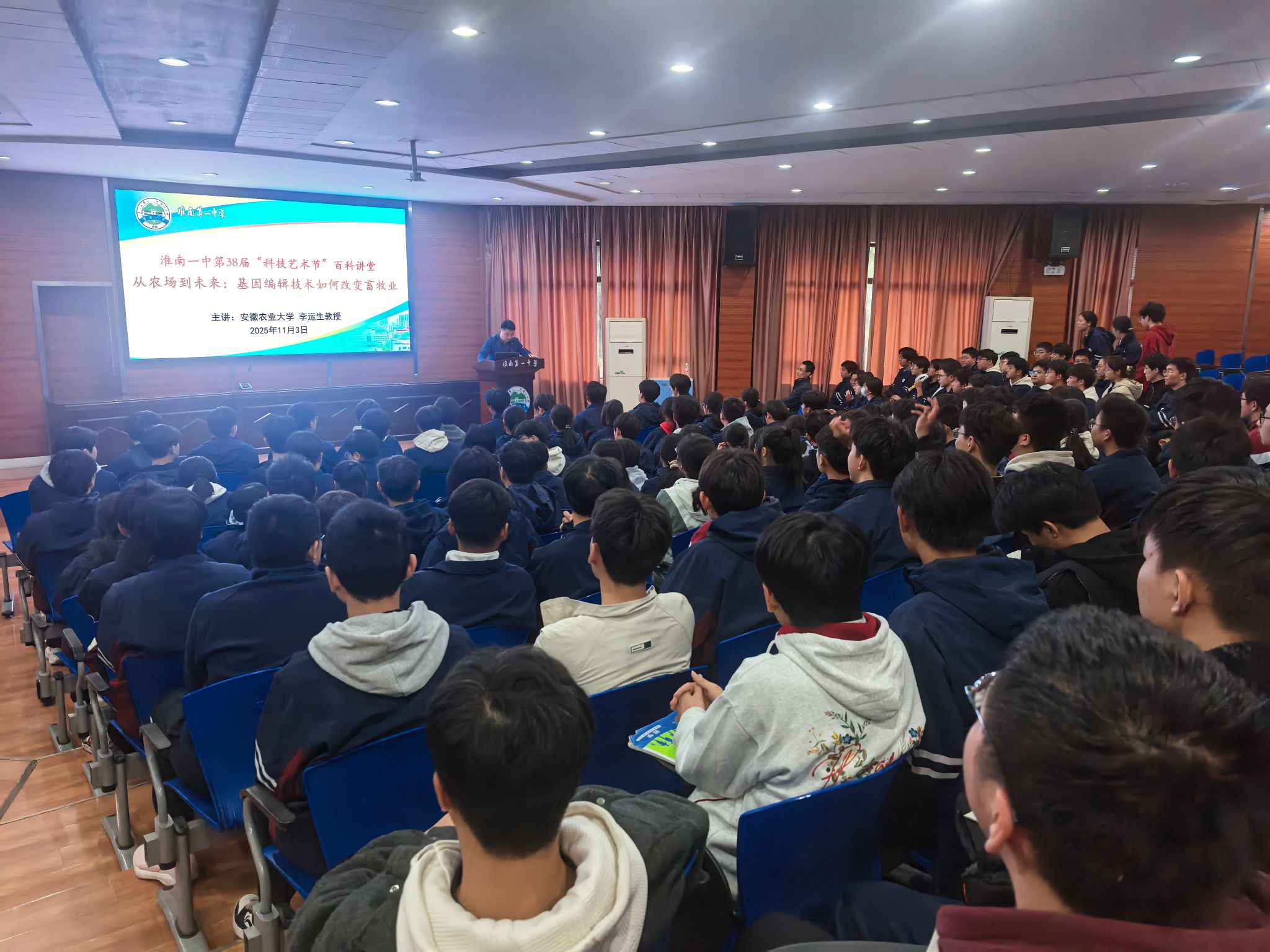 本网讯 11月3日下午,学院动物遗传育种与繁殖系主任李运生等一行赴淮南一中参加第38届“科技艺术节”百科讲堂,为该校学生带来了一场题为“从农场到未来:基因编辑技术如何改变畜牧业”的专题报告。淮南一中校长李晓坤、教务处主任王海、政教处主任周坦及部分高二年级学生参加了报告会。