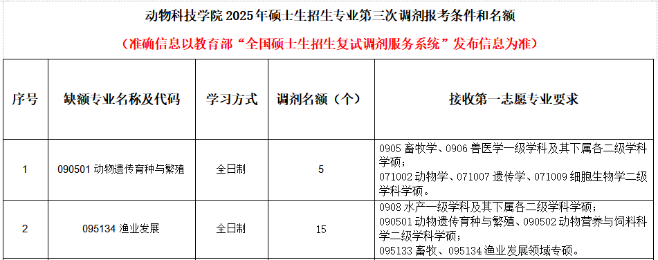 各位考生:我院动物遗传育种与繁殖学硕、渔业发展专硕调剂系统第三次开放时间为2025年4月15日12时,系统关闭时间根据生源情况确定,欢迎全国各地优秀考生调剂到我院继续深造。动物科技学院2025年4月15日