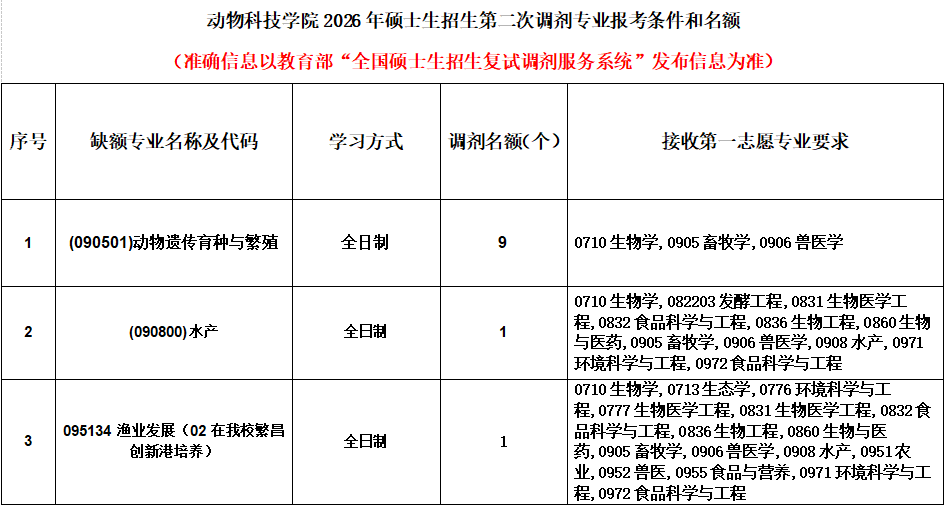 为进一步加强我校2026年硕士生招生调剂工作,根据教育部《2026年全国硕士研究生招生工作管理规定》(教学〔2025〕42号)、《关于做好2026年全国硕士研究生招生复试录取工作的通知》(教学司〔2026〕3号)、《安徽农业大学2026年硕士研究生招生调剂公告》等文件精神,特制定本公告: